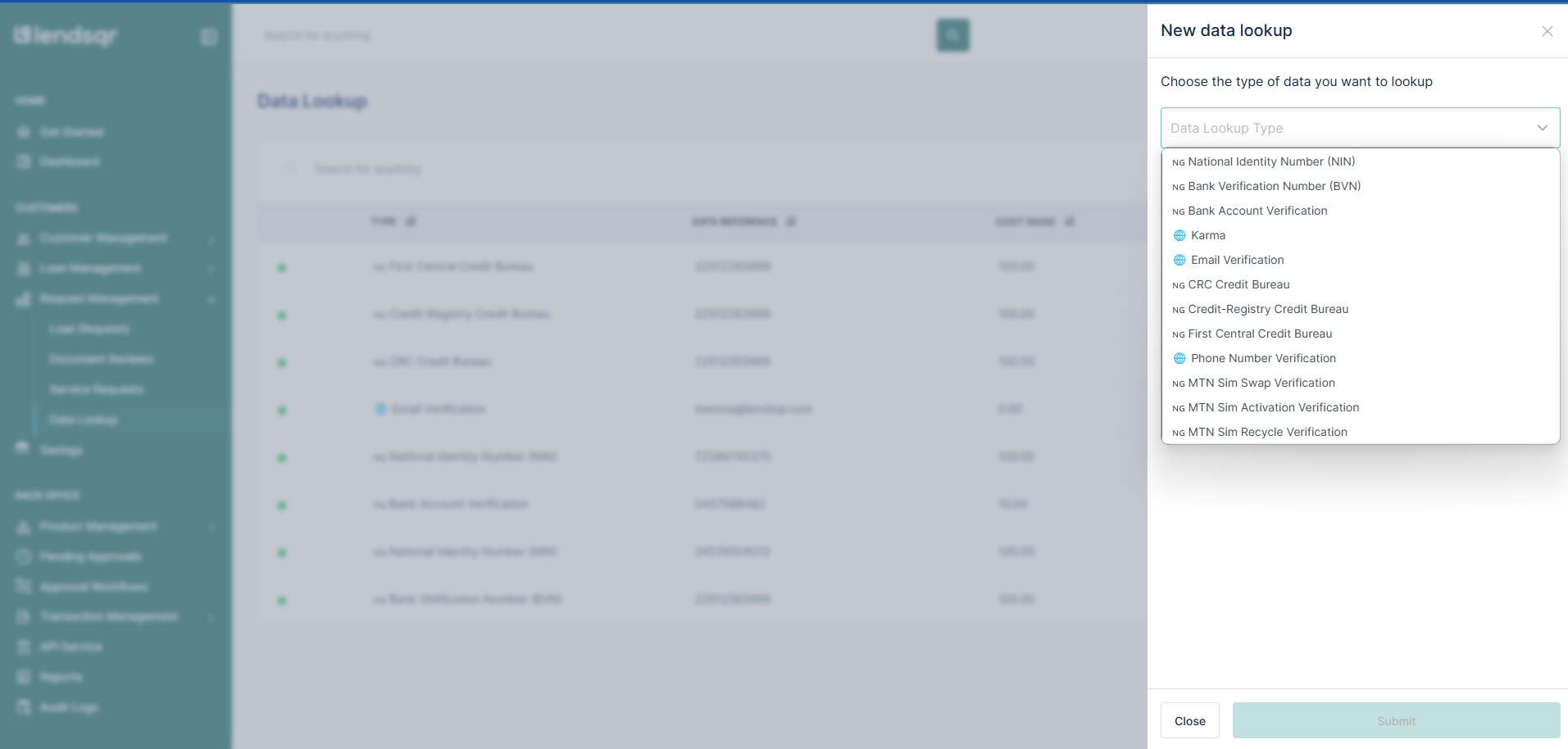 The data Lookup feature provides lenders with a centralized platform to directly access and verify their customers' information. Lenders are able to access this module via a "Data Lookup" option in the sidebar. This feature allows lenders to select a service, fill out a  form with the required inputs like BVN or account number, and upon submission, the system will process the request, charge the lender, and display the results.